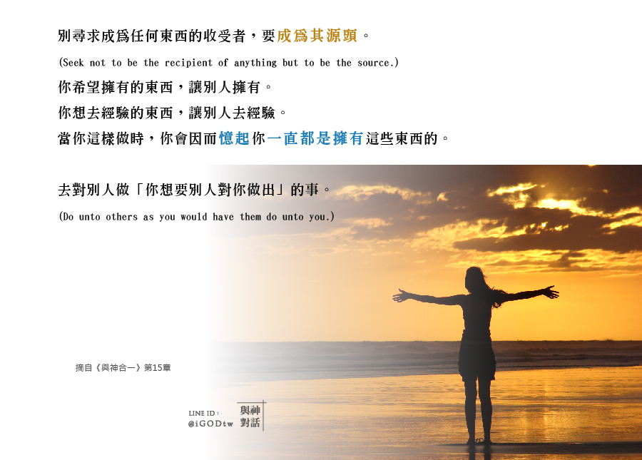 別尋求成為任何東西的收受者,要成為其源頭 (Seek not to be the recipient of anything but to be the source.)。你希望擁有的東西,讓別人擁有。你想去經驗的東西,讓別人去經驗。當你這樣做時,你會因而憶起你一直都是擁有這些東西的。