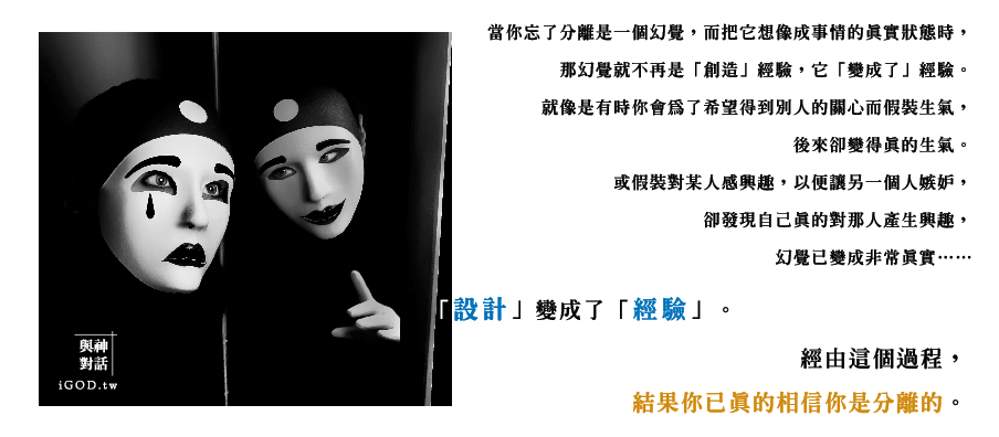 可是當你忘了分離是一個幻覺,而把它想像成事情的真實狀態時,那幻覺就不再是「 創造」經驗,它「變成了」經驗。 (The illusion no longer create experience, it becomes experience.)