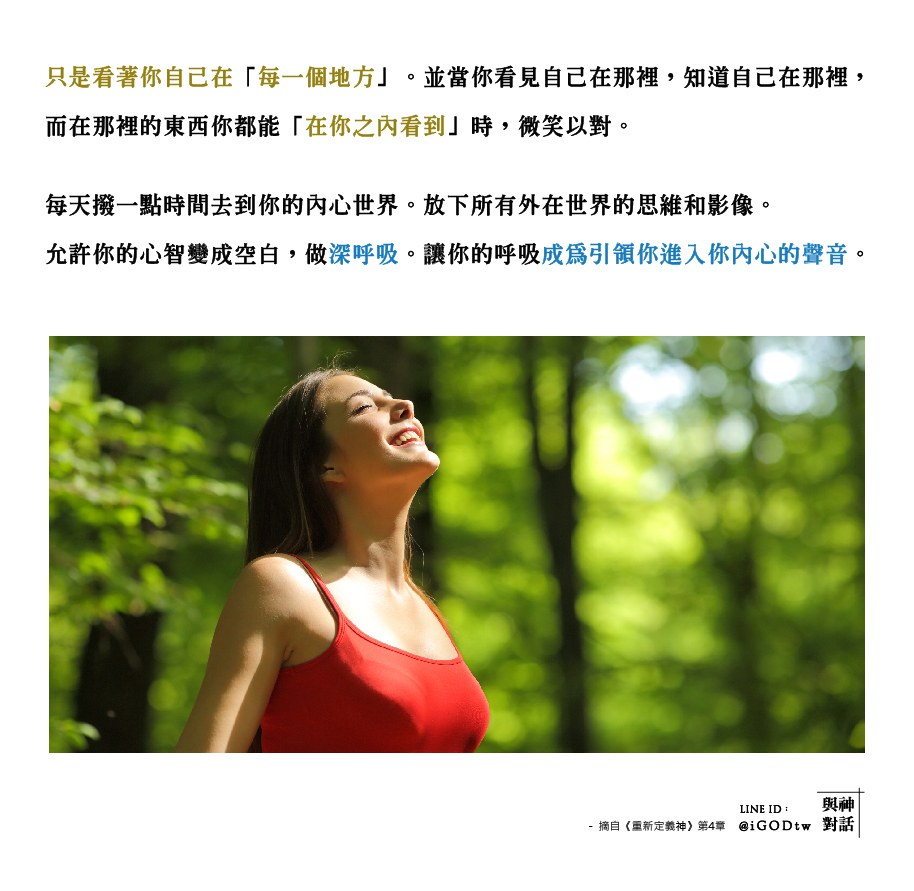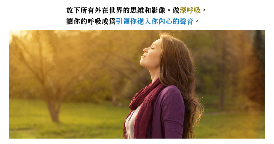 每天撥一點時間去到你的內心世界。當你在通往這內在世界移動時,放下所有外在世界的思維和影像。允許你的心智變成空白,做深呼吸,並集中精神在你的呼吸上。讓你的呼吸成為引領你進入你內心的聲音。