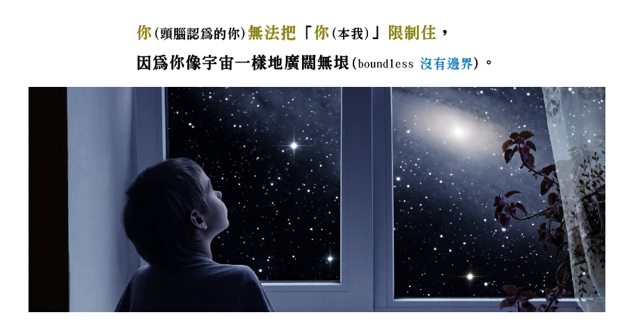 你(頭腦認為的你)無法把「你(本我)」限制住,因為你像宇宙一樣地廣闊無垠(boundless 沒有邊界)。然而,你能以想像的方式,創造一個關於你本我的界限的概念,並接受此界限。