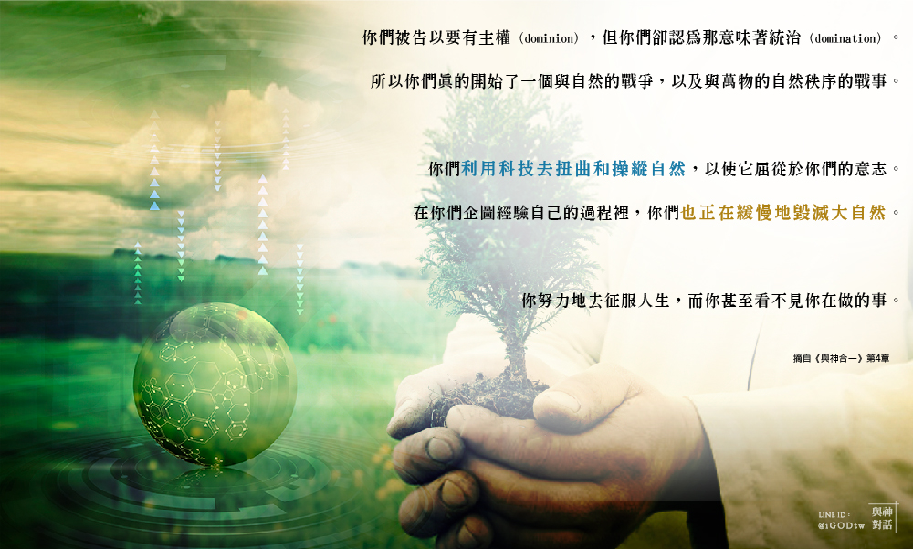 你們利用科技去扭曲和操縱自然,以使它屈從於你們的意志。在你們企圖經驗自己如你們自然已是的樣子的過程裡,你們也正在緩慢地毀滅大自然如它自然已是的樣子。