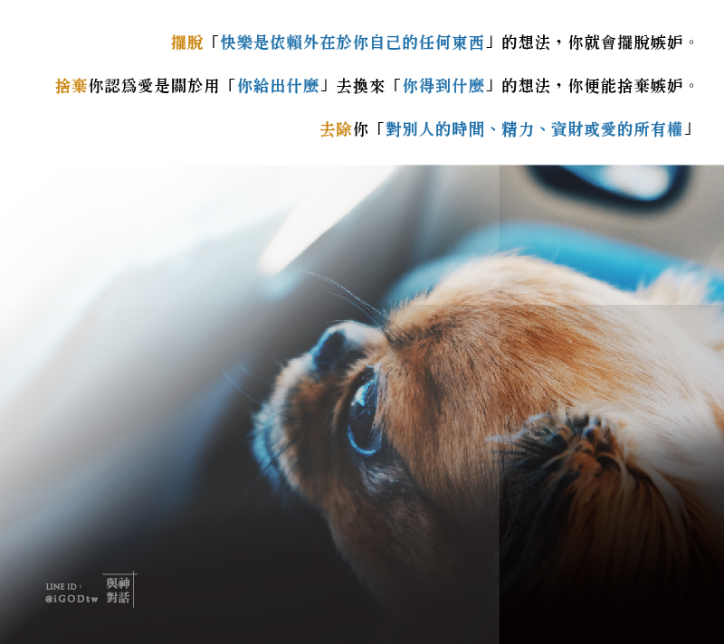 去除你「對別人的時間、精力、資財或愛的所有權」的宣告,你便能去除嫉妒。