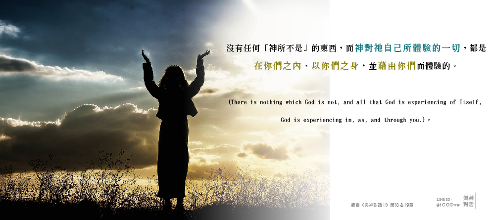 沒有任何「神所不是」的東西,而神對祂自己所體驗的一切,都是在你們之內、以你們之身,並藉由你們而體驗的(There is nothing which God is not, and all that God is experiencing of Itself, God is experiencing in, as, and through you.)。而你所感受到的氣憤,是你的氣憤。(哈!那到底有沒有所謂的「神之怒」?你認為是誰在生氣?)