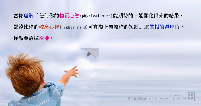 當你理解「任何你的物質心智(頭腦)能期待的、能形象化出來的結果,都遠比你的較高心智(高我/本我/大我)可實際上帶給你的短缺」這真相的道理時,你就會放掉期待。