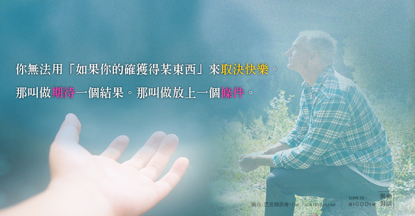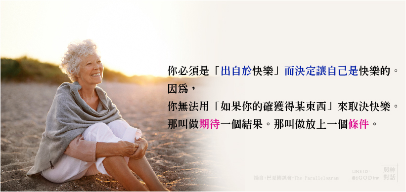 切記:你必須是「出自於快樂」而決定讓自己是快樂的。因為你無法用「如果你的確獲得這東西」來取決快樂。那叫做期待一個結果。那叫做放上一個條件。