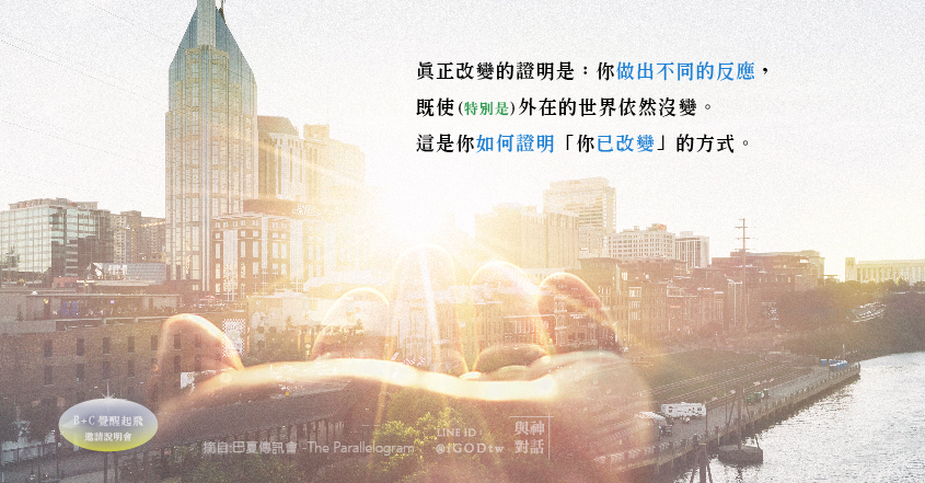 真正改變的證明是:你做出不同的反應,既使(特別是)外在的世界依然沒變。那是你如何證明「你已改變」的方式。而當你證明你已經改變,外在世界會知道你的改變,並反射給你相同的改變(如同鏡子的反射)。