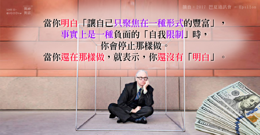 所以說,當你明白那「只集中在一種形式的豐富」的聚焦事實上是一種負面的限制時,你會停止那樣做。(巴夏常提醒:當你還在那樣做就表示,你還沒有明白。)