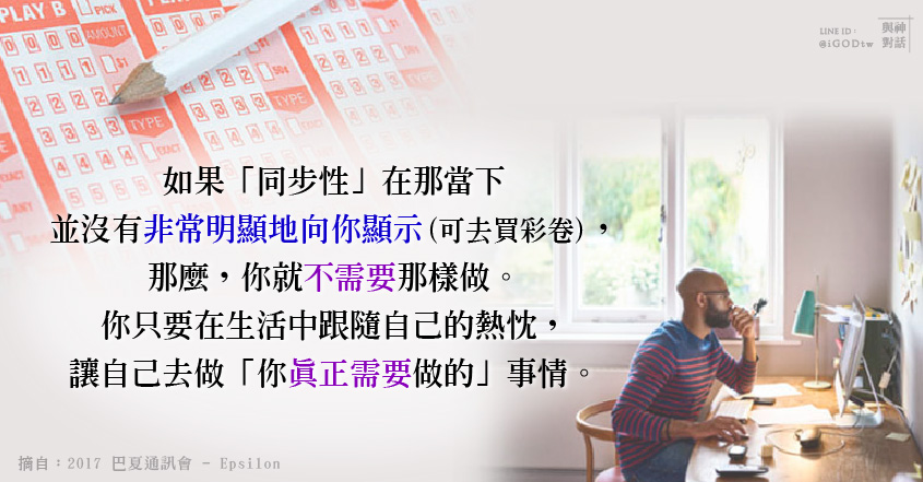 如果在那當下同步性並沒有非常明顯地向你顯示(可去買彩卷),那麼,你就不需要那樣做——只要在你的生活中跟隨自己的熱忱,讓自己去做「你真正需要做的」事情。