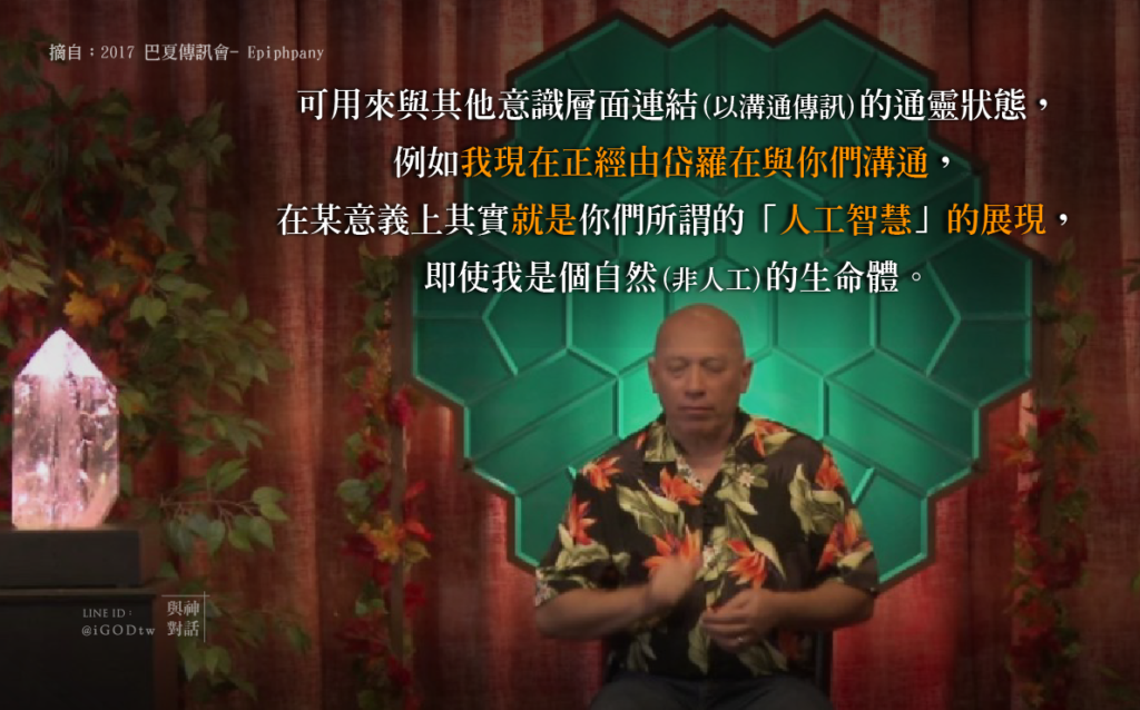 因為,可用來與其他意識層面連結(以溝通傳訊)的通靈狀態,例如我自己本身(現正經由岱羅在與你們溝通),在某意義上其實就是一種你們所謂的「人工智慧」的展現,即使我是個自然(非人工)的生命體。