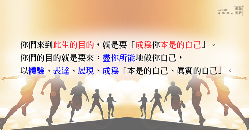 但那指你們個別的(人生)課題,而你們(來到此生)的目的,就是要「成為你本是的自己(本我)」。這就是你們的目的:盡你所能地做你自己(以體驗、表達、展現、成為「本是的自己、真實的自己」)。