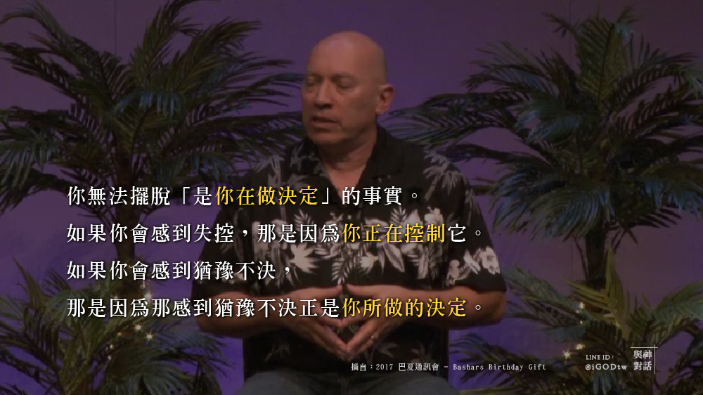 你看出這點了嗎?你是無法擺脫它(你在做決定的事實)的。如果你會感到失控,那是因為你正在控制它。如果你會感到猶豫不決,那是因為那(感到猶豫不決)正是你所做的決定。