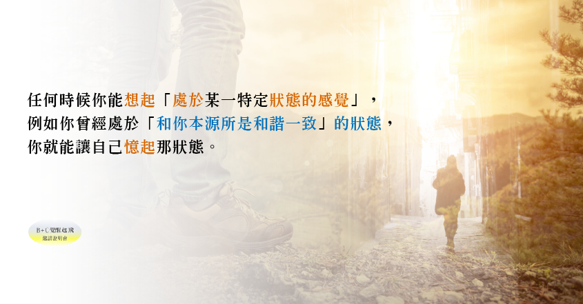任何時候,這是個秘訣,我再說一次,任何時候你能想起「處於某一特定狀態的感覺」,你必須實際上已經處於過那個狀態(例如:你本源所是的狀態),才能讓你憶起自己曾經處於過那狀態。