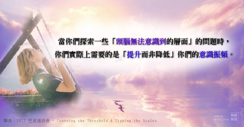 所以,當你們在潛意識和無意識心智裡探索一些「你們知道答案藏在那裡面」的問題時,你們實際上需要的是:提升(而非降低)你們的意識振頻。