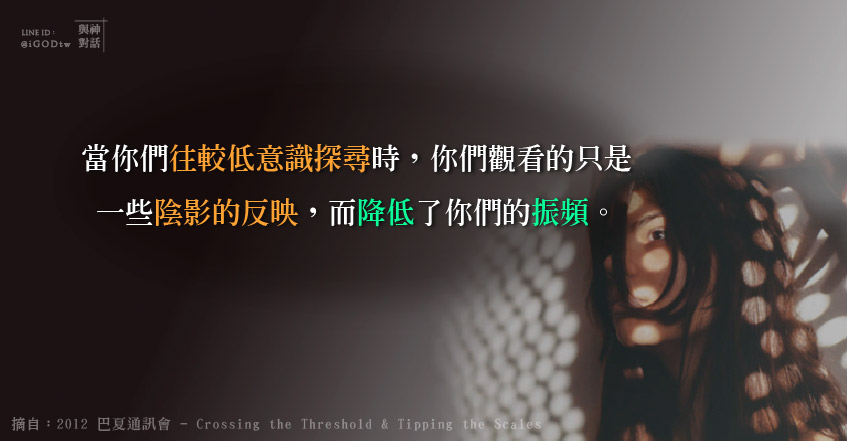 而當你們往下(往較低意識)探尋這些事物時,你們觀看到的只是一些陰影的反映,而降低了你們在「與潛意識和無意識心智對應」時的振頻。