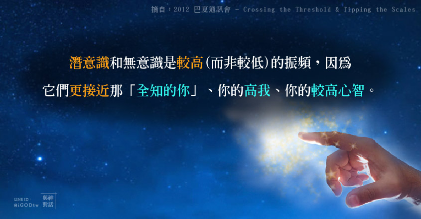 潛意識和無意識是較高(而非較低)的振頻,因為它們更接近那「全知的你」,你的高我(較高心智)。就某意義的角度面來說,你的高我已將自己分解成「你正在遊戲的遊戲平台」,以及正在玩此遊戲中的一個分子的「你」。