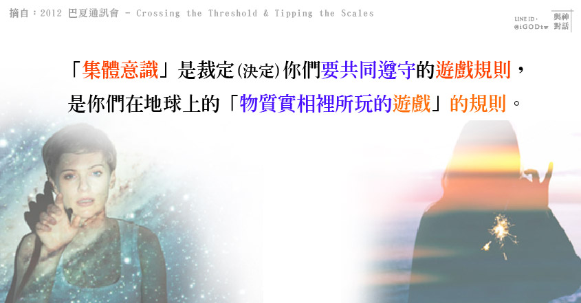 就此角度來說,「集體意識」是裁定(決定)你們要共同遵守的遊戲規則,你們在地球上的物質實相裡所玩的遊戲的規則。