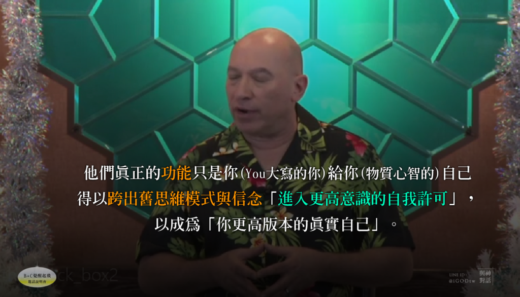 即使包含這「通靈」的概念,或者某些如水晶之類的物體,或某些書籍,或某些儀式,或某些靜坐冥想,這些全部都是你的更高心智(Self 高我)的一部分,在寫給你的一個讓你得以「進入更高意識的自我許可」,