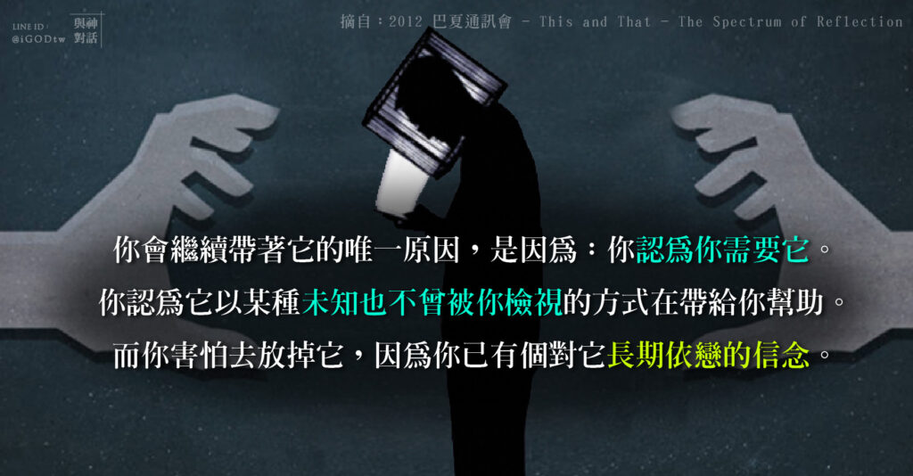 你認為它以某種(未知也不曾被你檢視的)方式在帶給你幫助。而你害怕去放掉它,因為你已有個對它長期依戀的信念。
