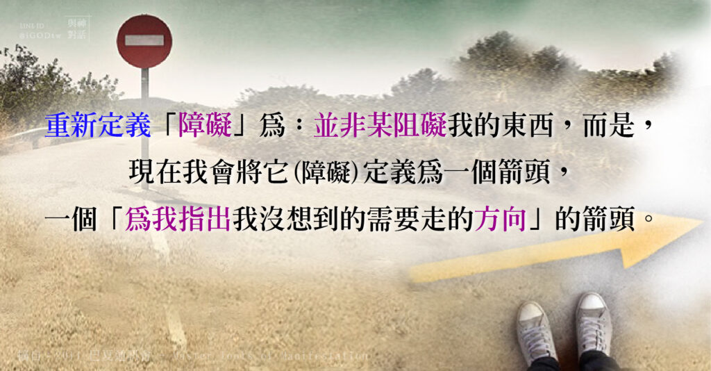 重新定義「障礙」為:並非某阻礙我的東西,而是,現在我會將它(所謂的障礙)定義為一個箭頭,一個「為我指出我沒想到的需要走的方向」的箭頭。