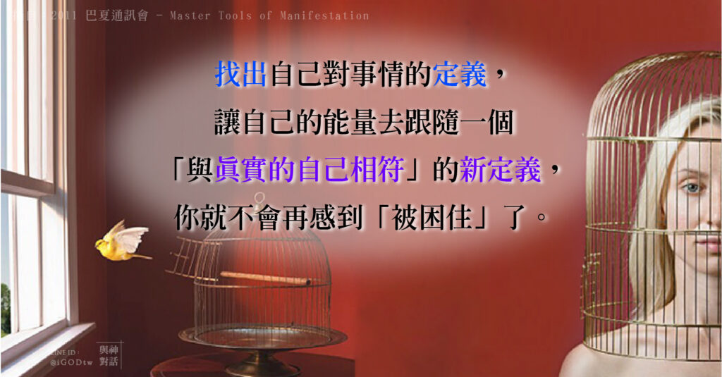 找出那個定義是什麼、認出它,這樣你便能夠改變它,而讓自己的能量去跟隨一個「與真實的自己相符」的新定義,那麼你就不會再感到「被困住」了。