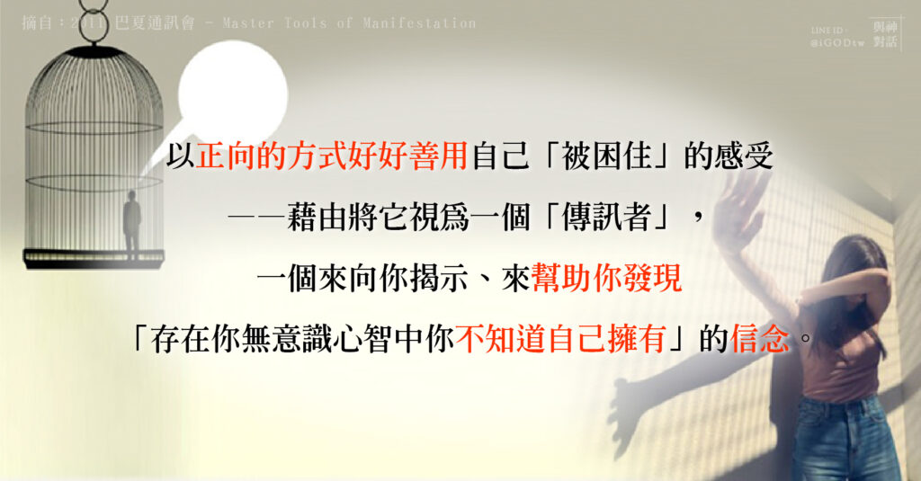因此,以正向的方式好好善用自己「被困住」的感受——藉由將它視為一個「傳訊者」,一個來向你揭示、來幫助你發現「存在你無意識心智中你不知道自己擁有」的信念。