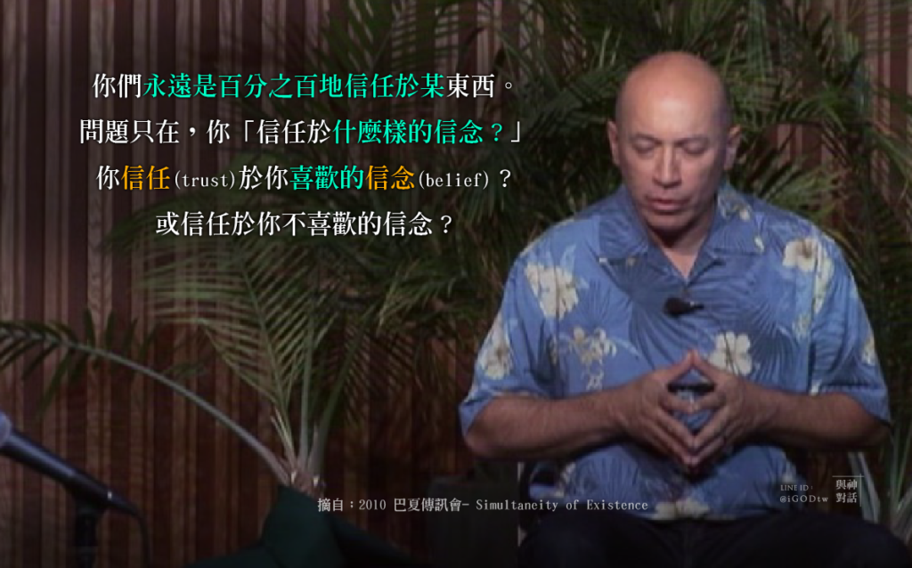 你們永遠是百分之百地信任於某東西。問題只在,你「信任於什麼樣的信念?」(信任於你喜歡的信念?或你不喜歡的信念?)。