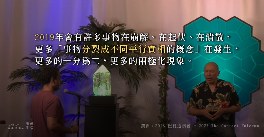 你們會發現,2019年會有許多事物在崩解、在起伏、在潰散,更多「事物分裂成不同平行實相的概念」在發生,更多的一分為二,更多的兩極化現象。