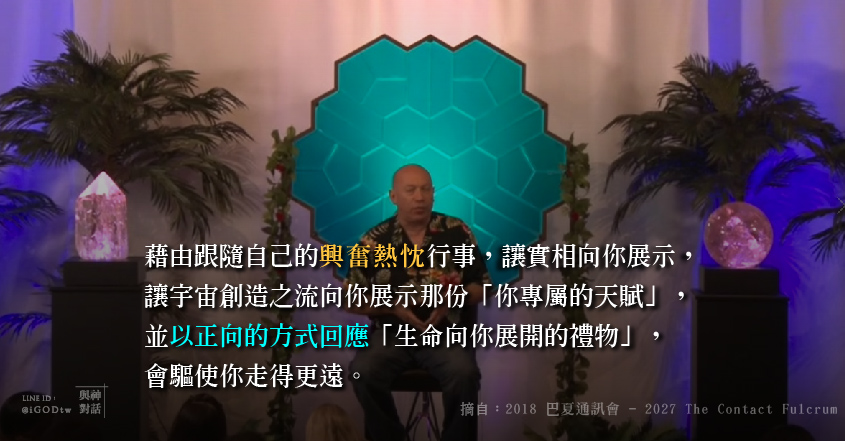 藉由跟隨你的喜悅,藉由盡你所能地依自己的熱忱行事,放下「你堅持事物該如何發生」的成見,讓實相向你展示,讓宇宙創造之流向你展示那份「你專屬的天賦」,並以正向的方式回應這些(宇宙造物向你展示的禮物),會驅使你走得更遠。