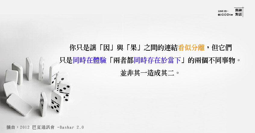 你只是讓那些「因」與「果」之間的連結看似分離,但它們只是同時在體驗「兩者都同時存在於當下」的兩個不同事物。並非其一造成其二(彼此間並非真的有因果關係,只是可以有因果體驗」)