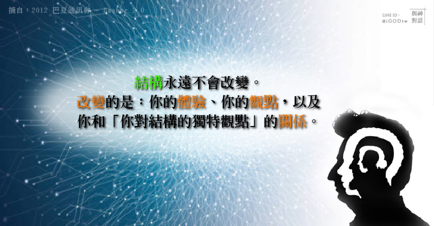 整個結構永遠是整個結構,永不改變。但改變的是:你的體驗、你的觀點,以及你和「你對結構的獨特觀點」的關係
