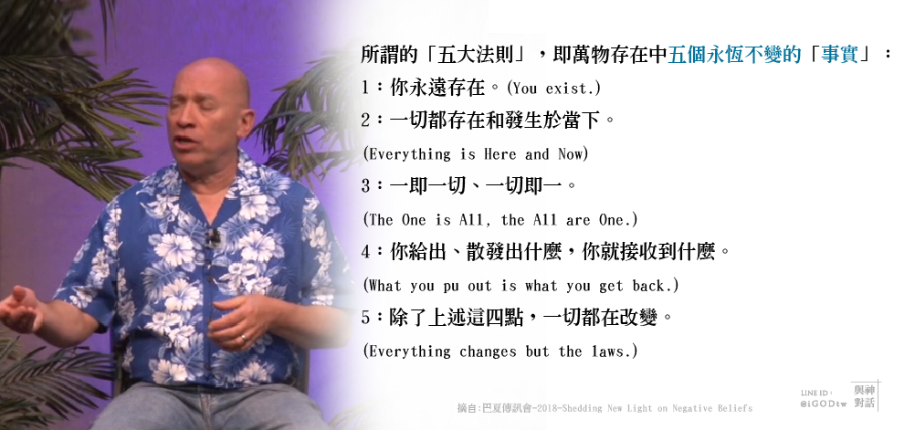 1:你永遠存在。2:一切都存在和發生於當下。3:一即一切、一切即一。4:你給出、散發出什麼,你就接收到什麼。5:除了上述這四點,一切都在改變。