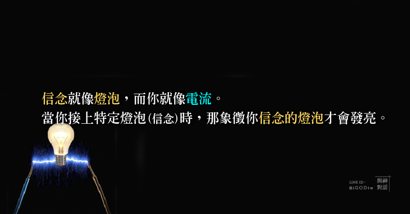 信念就像燈泡,而你就像電流。當你接上特定信念(燈泡)時,那象徵你信念的燈泡才會發亮。