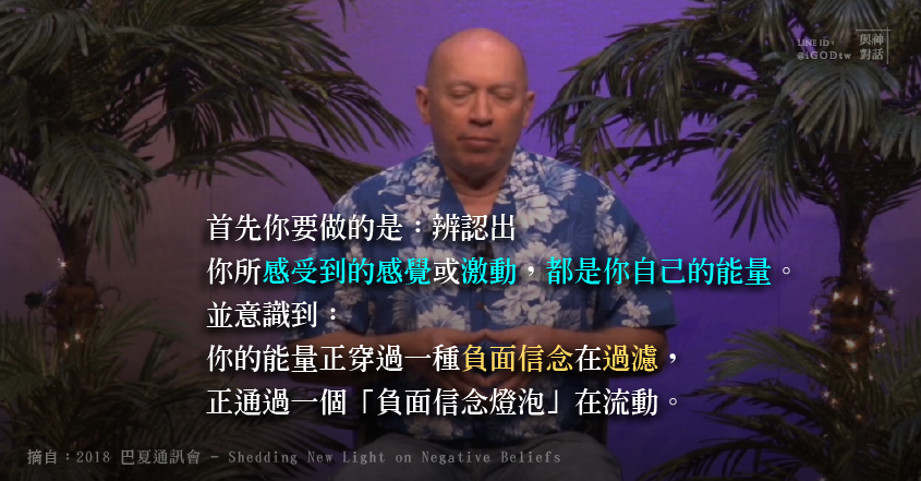就如同我們所說的,首先你要做的是:辨認出你所感受到的感覺或激動,都是你自己的能量。而你唯一能夠那樣地感受到自己能量的方式,就是我正在引起你們注意的:覺察你的能量正穿過一種負面信念在過濾,正通過一個「負面信念燈泡」在流動。