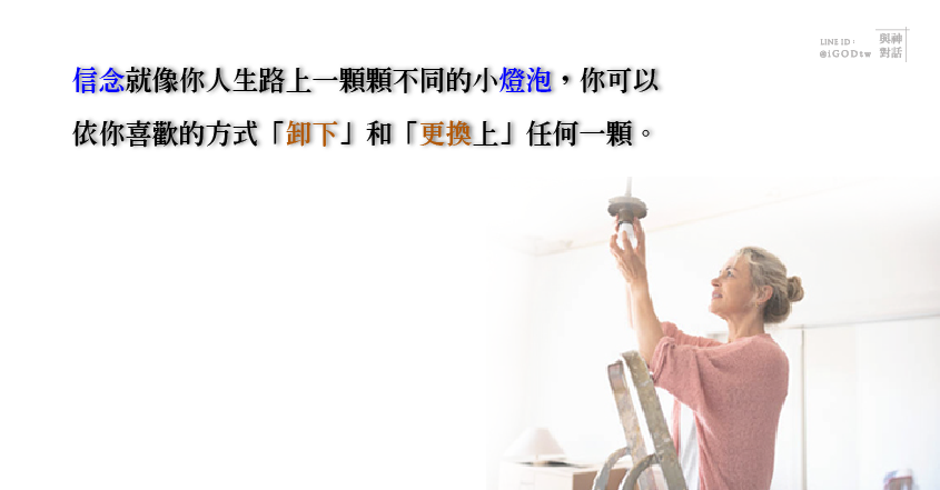 因而,開始就「信念是一顆顆不同的小燈泡」的比喻想像一下,你可以依你喜歡的方式「卸轉下」和「安裝上」你人生路上的任何一顆燈泡。