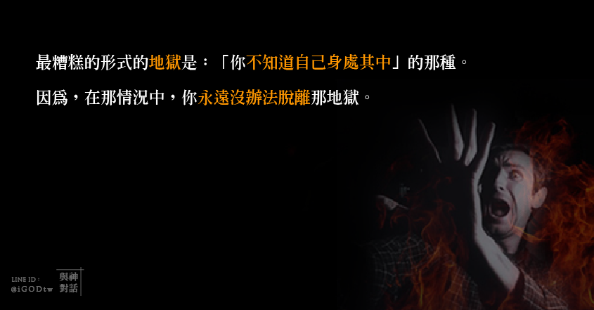 「什麼是最糟形式的地獄?」答案是:「你不知道自己身處在裡面」的那種地獄。因為,在那情況中,你永遠沒辦法脫離那地獄。
