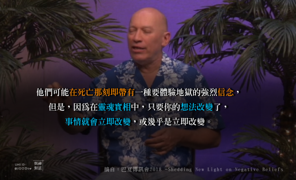因為這點的概念是,他們可能在死亡那刻即帶有一種要體驗地獄的強烈信念,但是,因為在靈魂實相中,只要你的想法改變了,事情就會立即改變,或幾乎是立即改變。