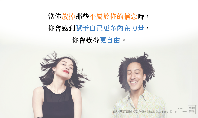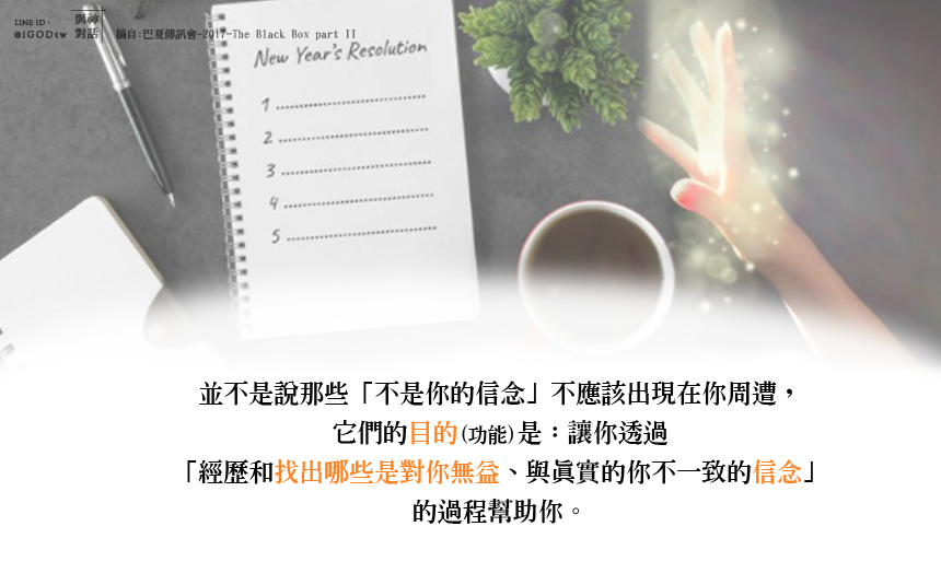 因此,並不是說那些「不是你的信念」不應該出現在你周遭,它們的目的(功能)是:讓你透過「經歷和找出哪些是對你無益、與真實的你不一致的信念」的過程幫助你。