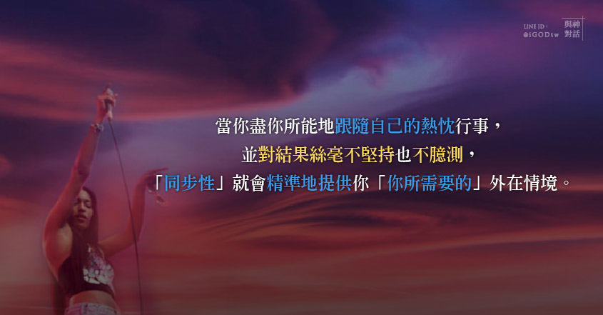 藉由「盡你所能地跟隨你的熱忱,並對結果絲毫不抱堅持或臆測」,同步性就會精準地提供你「你所需要的」外在情境(外在的人事物)。