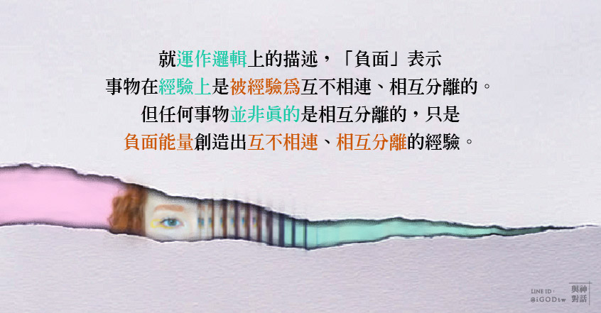 因為「負面」,就其運作邏輯上的描述,表示事物在經驗上是被經驗為互不相連、相互分離的。但任何事物並非真的是相互分離的,