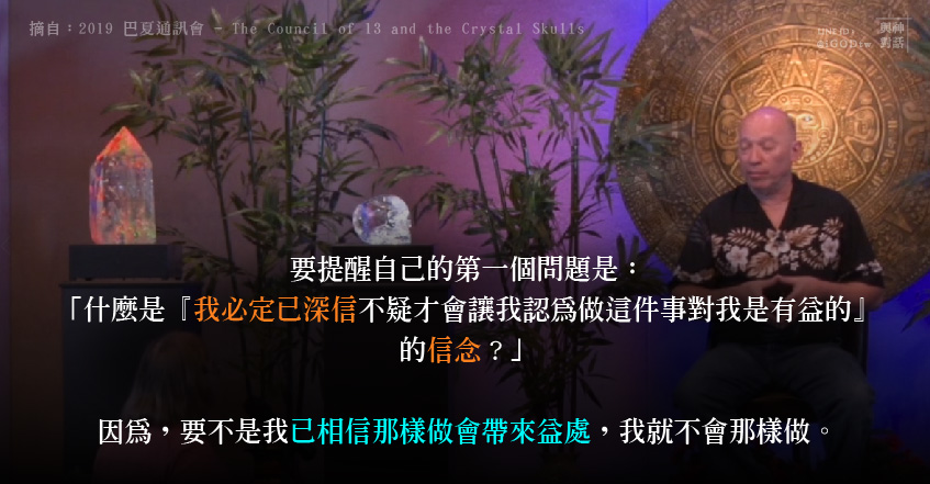 要提醒自己的第一個問題是:「什麼是『我必定已深信不疑才會讓我認為做這件事對我是有益的』的信念?因為,要不是我已相信那樣做會帶來益處,我就不會那樣做。」