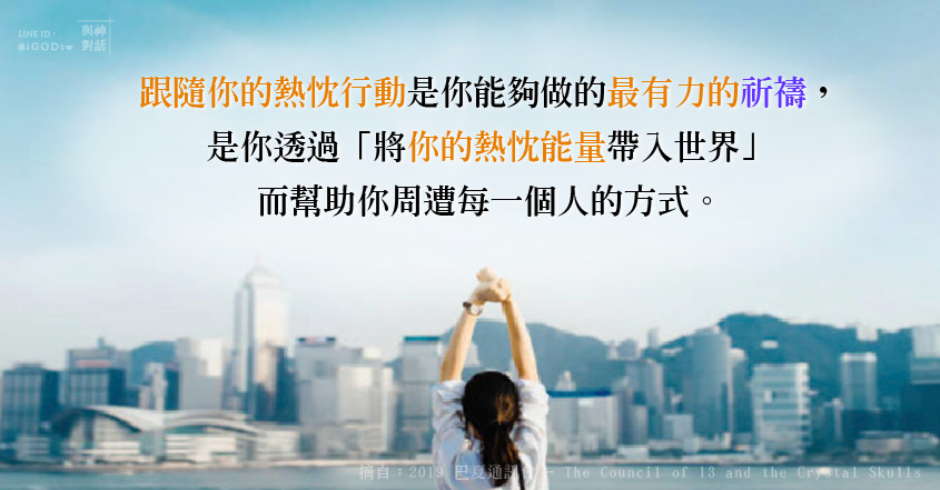 因此,跟隨你的熱忱行動是你所能做的最強大有力的祈禱,是你透過「將你熱忱的能量帶入世界」而幫助每個人的方式。