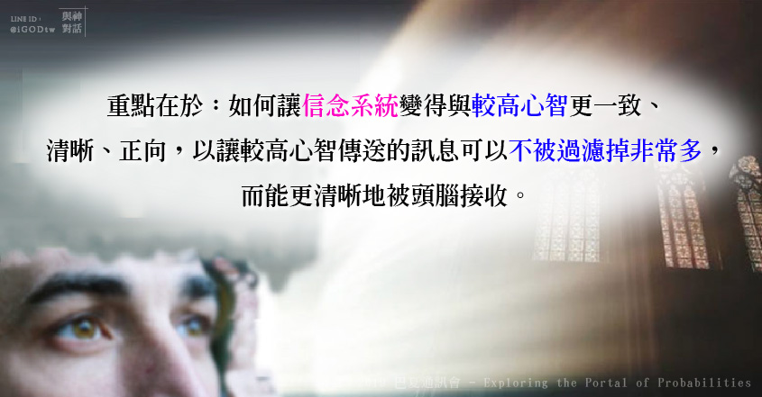 所以這議題的重點在於:如何讓信念系統變得與較高心智更一致、更清晰、更正向,以讓較高心智傳送的訊息可以不被過濾掉非常多,而能更清晰地被頭腦接收。