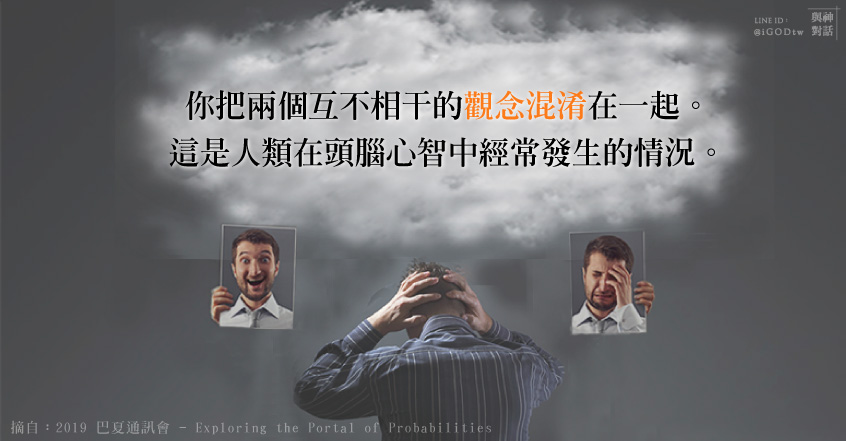 你把兩個互不相干的想法連在一起(不相干的觀念混淆在一起)。這是你們星球上的人在頭腦心智中經常發生的事情之一。