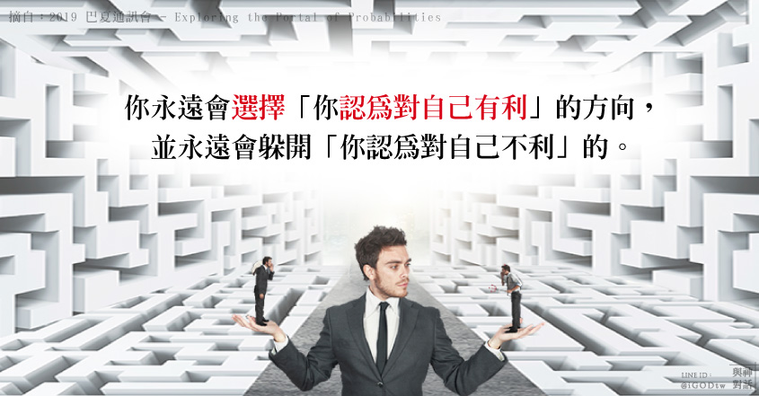 你們所有的人永遠都會,必定會,而我的意思是毫無例外,因為這就是人類與生俱來(被製造出來)的運作方式:你們永遠會選擇「你認為對自己有利」的方向,並永遠會躲開「你認為對自己不利」的。