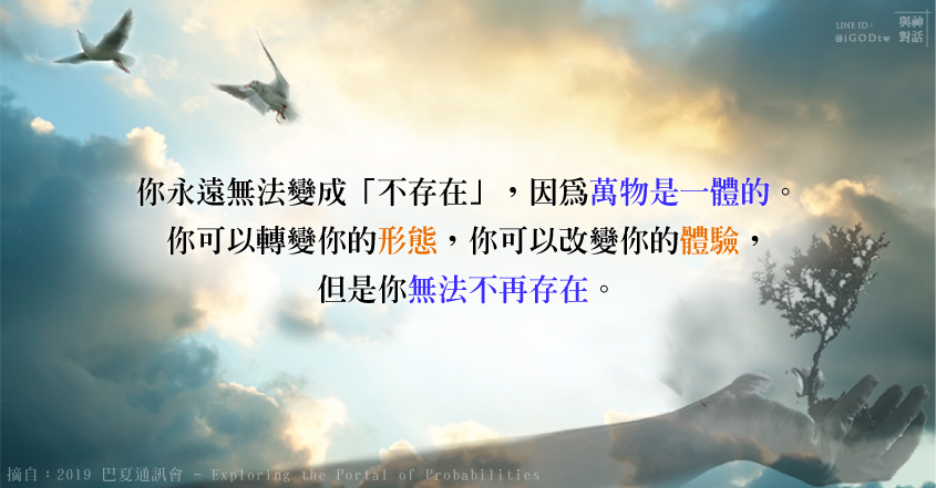 所以這概念是:你永遠無法停止存在。你可以轉變你的形態,你可以改變你的體驗,但是你無法不再存在。