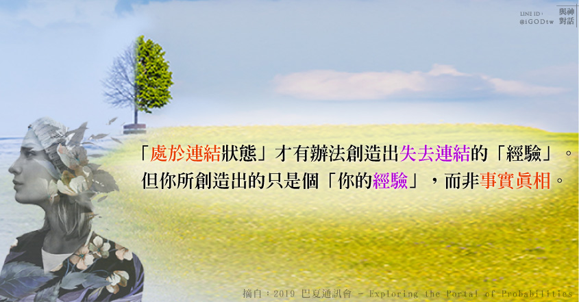 你可以創造出一種「失去連結」的經驗,然而,你必須是連結的才能創造出一種沒有相連結的經驗。(意思是:「處於連結狀態」才有辦法創造出失去連結的「經驗」,那只是個「你的經驗」而非事實真相。)