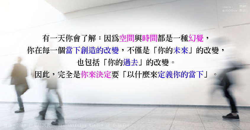 那麼,你同時也會明白:因為空間與時間都是一種幻覺,你在每一個當下創造的改變,不僅包括「你的未來」,也包括「你的過去」的改變。