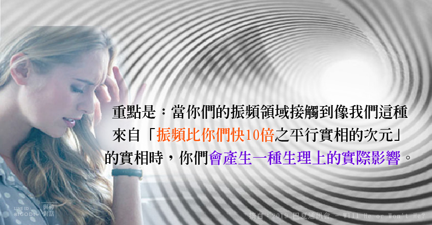 我們在說的是:當你們的振頻領域接觸到像我們這種「來自振頻比你們快10倍之平行實相的次元」的實相時,你們會產生一種生理上的實際影響。