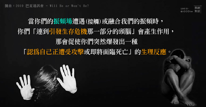 這概念是,當你們的振頻場遭遇(接觸)或融合我們的振頻時,你們「連到引發生存危機那一部分的頭腦」會產生作用,