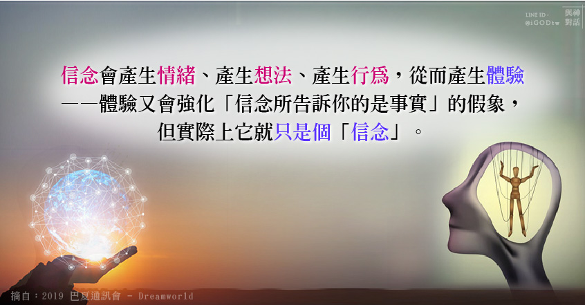 而當你經歷了一個行為,擁有了一個體驗;體驗了一個行為,而產生了一個想法、產生了一個感受——你知道,這一切都是由「信念」產生出的。
